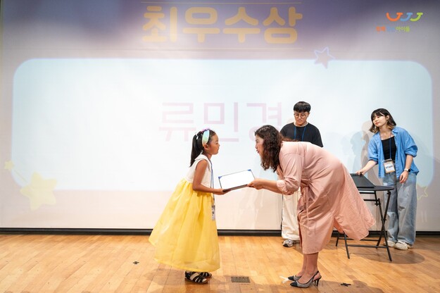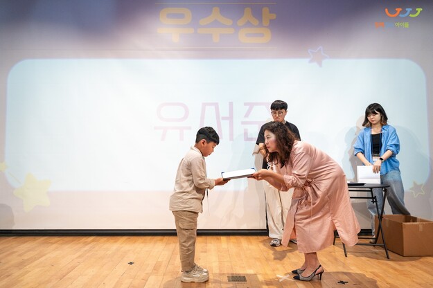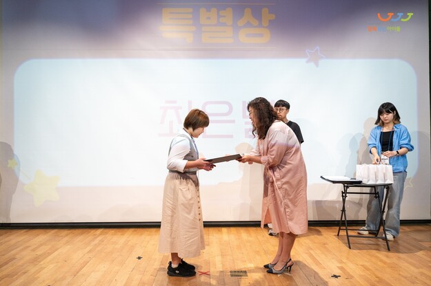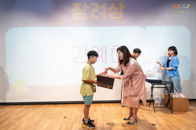 우수상, 장려상, 그리고 특별상 수상 어린이들이 모두 한 명씩 무대 위로 올라 상장과 부상을 받았어요.